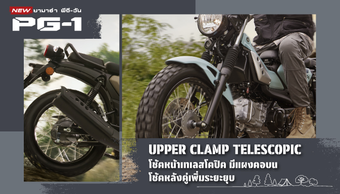 โช้คหน้าเทเลสโคปิคแบบมีแผงคอบน เสริมด้วยยางหุ้มโช้คสไตล์คลาสสิก โช้คหลังคู่ที่เพิ่มระยะยุบ ช่วยซับแรงกระแทก ทรงตัวได้ดี มันส์ได้ทุกเส้นทาง